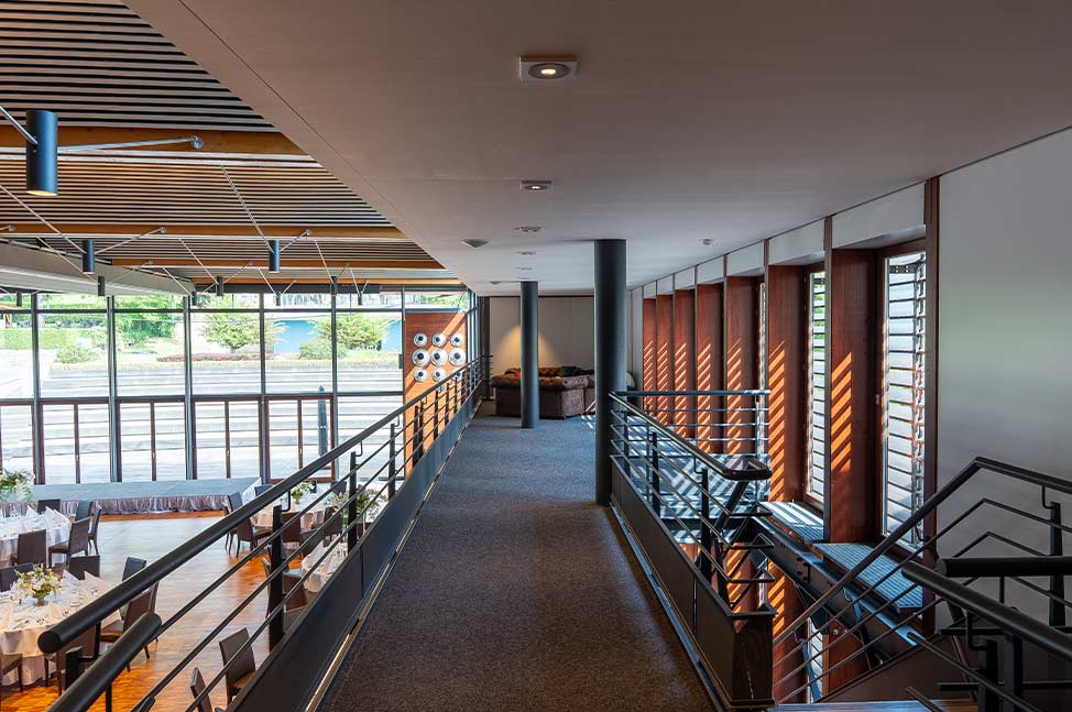 - Accès direct vers la terrasse et l’amphithéâtre bordant le parc thermal