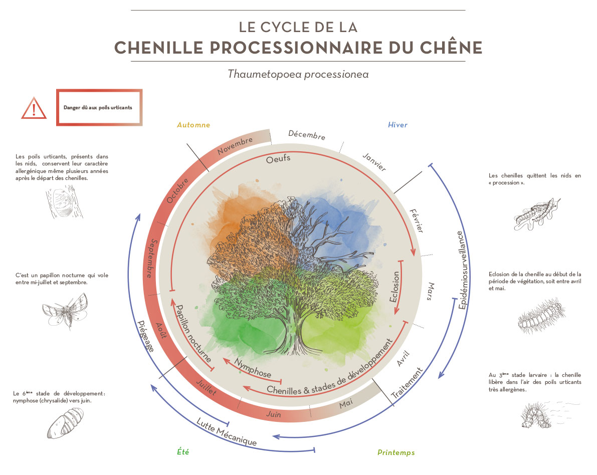 La processionnaire du chêne est un papillon nocturne qui vole entre mi-juillet et septembre. La chenille se développe en automne pour éclore au début de la période de végétation, soit entre avril et mai. Elle passe alors par 6 stades de développement pour arriver à la nymphose (chrysalide) vers juin. A partir du 3ème stade larvaire, la chenille libère dans l’air des poils urticants très allergènes pouvant provoquer des atteintes cutanées.
